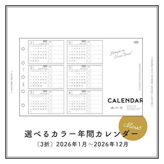 ※ご注文の前に※ 一部外製商品を除き、ご注文を受けてから印刷・作成に入る【受注生産】商品です。 表示されている在庫数は、現在ご注文いただける上限数となります。 ▼ご注文前にお読みください https://shop.46kuma-note.com/p/00002 ▼よくある質問 https://shop.46kuma-note.com/p/00001 --- 商品詳細 --- 【見開きで6ヶ月分のカレンダーが見渡せる】 黒・グレージュ・青の3色から色味をお選びいただけます。 ▼選べるカラーマンスリー https://shop.46kuma-note.com/items/66454616 と、カラーリング・フォントを合わせたので セットでご使用いただくと、より統一感が出て◎ カレンダー横にはイベント記入欄を設けたので、 友人・家族の誕生日や 楽しみにしているイベントなど ぜひ書き込んでワクワク感を高めてください! 【用紙カラーを選べます】 ・ナチュラル ・ホワイト の2色をご用意しております。 紙の厚みは、通常のコピー用紙よりも厚手の0.12mmで 手触りはコシがあって少しツルツルとしたイメージ。 万年筆でも裏抜けしにくいペーパーを使用しております。 (筆記感が気になる方は、ペーパー・印刷見本をお送りいたしますので別途お問合せください。) 【サイズ・セット内容】 2026年1月〜2026年12月(1シート) 日曜はじまり ※記載されている祝日は2025年9月現在のものになります。 法改正などにより変更になる可能性がございます。 ※こちらは角丸処理をしない商品となります。あらかじめご了承ください リフィルサイズ(折込時):約62x105mm 穴径:4mm