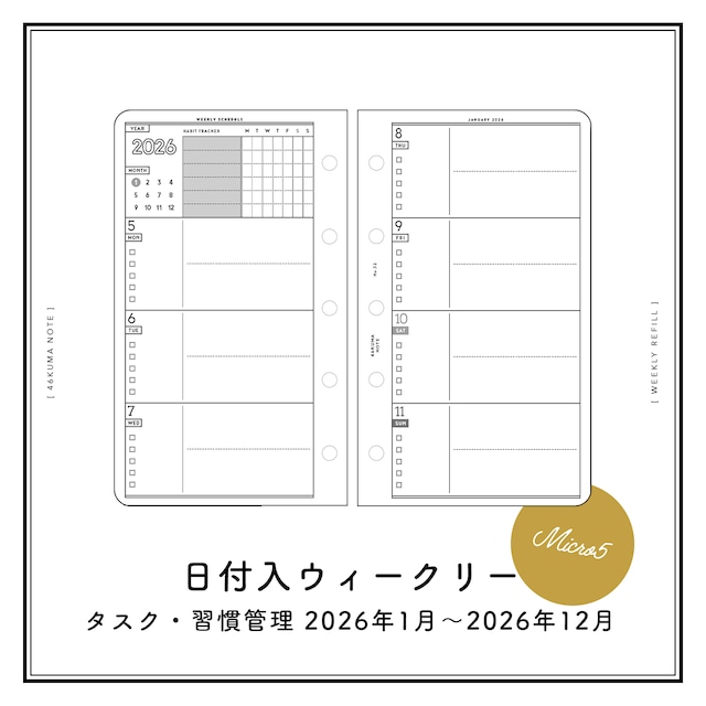 ※ご注文の前に※ 一部外製商品を除き、ご注文を受けてから印刷・作成に入る【受注生産】商品です。 表示されている在庫数は、現在ご注文いただける上限数となります。 ▼ご注文前にお読みください https://shop.46kuma-note.com/p/00002 ▼よくある質問 https://shop.46kuma-note.com/p/00001 --- 商品詳細 --- 【1ヶ月ごとに、マンスリーとウィークリーをひとまとまりに】 見開きで、マンスリーと今週が見渡せて便利。 ウィークリーに合わせて、マンスリーも月曜始まりにしているので 縦のラインで同曜日を確認できて視覚的にも分かりやすくなっています! (ウィークリーは、その週が終わったら当月の最終ページに移動させてご使用ください) ウィークリーの1/3部分に分割線を引いたので、 ・TODO & スケジュール ・ヘルスログ & 日記 ・行動ログ & 一言メモ などなど・・・書きたい項目を分かりやすくわけることが出来ます◎ 月ごとの表紙には、 ・イベント予定 ・チェックリスト ・当月の目標(+達成率) の記入欄付き! ▼フリーデイリー(1日1ページ) https://shop.46kuma-note.com/items/78914092 と同デザインでお作りしました。 ウィークリーでは書き足りない!という日は デイリーを足してお使いください。 【用紙カラーを選べます】 ・ナチュラル ・ホワイト の2色をご用意しております。 紙の厚みは、通常のコピー用紙よりも厚手の0.12mmで 手触りはコシがあって少しツルツルとしたイメージ。 万年筆でも裏抜けしにくいペーパーを使用しております。 (筆記感が気になる方は、ペーパー・印刷見本をお送りいたしますので別途お問合せください。) 【サイズ・セット内容】 2026年1月〜2026年12月(75シート) 月曜はじまり ※記載されている祝日は2025年9月現在のものになります。 法改正などにより変更になる可能性がございます。 リフィルサイズ:62x105mm 穴径:4mm