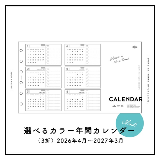 ※ご注文の前に※ 一部外製商品を除き、ご注文を受けてから印刷・作成に入る【受注生産】商品です。 表示されている在庫数は、現在ご注文いただける上限数となります。 ▼ご注文前にお読みください https://shop.46kuma-note.com/p/00002 ▼よくある質問 https://shop.46kuma-note.com/p/00001 --- 商品詳細 --- 【見開きで6ヶ月分のカレンダーが見渡せる】 黒・グレージュ・青の3色から色味をお選びいただけます。 ▼選べるカラーマンスリー https://shop.46kuma-note.com/items/66454568 と、カラーリング・フォントを合わせたので セットでご使用いただくと、より統一感が出て◎ カレンダー横にはイベント記入欄を設けたので、 友人・家族の誕生日や 楽しみにしているイベントなど ぜひ書き込んでワクワク感を高めてください! 【用紙カラーを選べます】 ・ナチュラル ・ホワイト の2色をご用意しております。 紙の厚みは、通常のコピー用紙よりも厚手の0.12mmで 手触りはコシがあって少しツルツルとしたイメージ。 万年筆でも裏抜けしにくいペーパーを使用しております。 (筆記感が気になる方は、ペーパー・印刷見本をお送りいたしますので別途お問合せください。) 【サイズ・セット内容】 2026年4月〜2027年3月(1シート) 日曜はじまり ※記載されている祝日は2026年2月現在のものになります。 法改正などにより変更になる可能性がございます。 ※こちらは角丸処理をしない商品となります。あらかじめご了承ください リフィルサイズ(折込時):約80x127mm 穴径:5mm