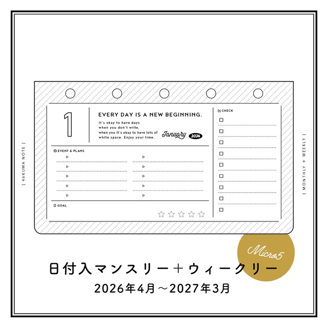 ※ご注文の前に※ 一部外製商品を除き、ご注文を受けてから印刷・作成に入る【受注生産】商品です。 表示されている在庫数は、現在ご注文いただける上限数となります。 ▼ご注文前にお読みください https://shop.46kuma-note.com/p/00002 ▼よくある質問 https://shop.46kuma-note.com/p/00001 --- 商品詳細 --- 【1ヶ月ごとに、マンスリーとウィークリーをひとまとまりに】 見開きで、マンスリーと今週が見渡せて便利。 ウィークリーに合わせて、マンスリーも月曜始まりにしているので 縦のラインで同曜日を確認できて視覚的にも分かりやすくなっています! (ウィークリーは、その週が終わったら当月の最終ページに移動させてご使用ください) ウィークリーの1/3部分に分割線を引いたので、 ・TODO & スケジュール ・ヘルスログ & 日記 ・行動ログ & 一言メモ などなど・・・書きたい項目を分かりやすくわけることが出来ます◎ 月ごとの表紙には、 ・イベント予定 ・チェックリスト ・当月の目標(+達成率) の記入欄付き! ▼フリーデイリー(1日1ページ) https://shop.46kuma-note.com/items/78914092 と同デザインでお作りしました。 ウィークリーでは書き足りない!という日は デイリーを足してお使いください。 【用紙カラーを選べます】 ・ナチュラル ・ホワイト の2色をご用意しております。 紙の厚みは、通常のコピー用紙よりも厚手の0.12mmで 手触りはコシがあって少しツルツルとしたイメージ。 万年筆でも裏抜けしにくいペーパーを使用しております。 (筆記感が気になる方は、ペーパー・印刷見本をお送りいたしますので別途お問合せください。) 【サイズ・セット内容】 2026年4月〜2027年3月(73シート) 月曜はじまり ※記載されている祝日は2026年2月現在のものになります。 法改正などにより変更になる可能性がございます。 リフィルサイズ:62x105mm 穴径:4mm