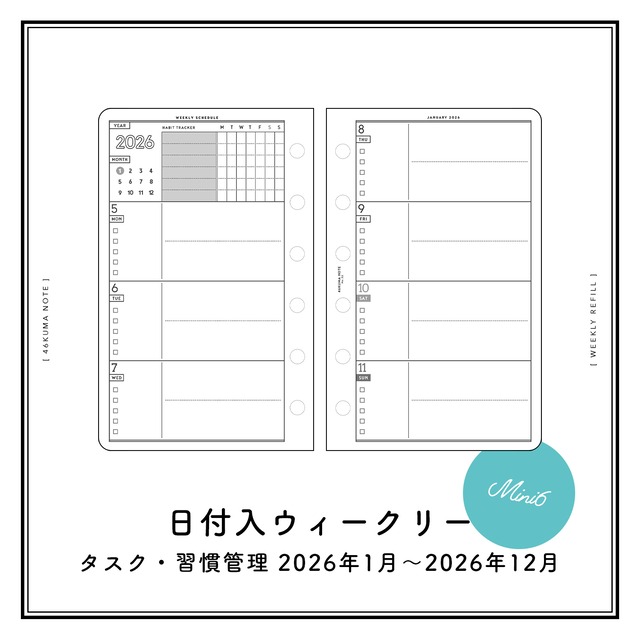 ※ご注文の前に※ 一部外製商品を除き、ご注文を受けてから印刷・作成に入る【受注生産】商品です。 表示されている在庫数は、現在ご注文いただける上限数となります。 ▼ご注文前にお読みください https://shop.46kuma-note.com/p/00002 ▼よくある質問 https://shop.46kuma-note.com/p/00001 --- 商品詳細 --- 【1ヶ月ごとに、マンスリーとウィークリーをひとまとまりに】 見開きで、マンスリーと今週が見渡せて便利。 ウィークリーに合わせて、マンスリーも月曜始まりにしているので 縦のラインで同曜日を確認できて視覚的にも分かりやすくなっています! (ウィークリーは、その週が終わったら当月の最終ページに移動させてご使用ください) ウィークリーの1/3部分に分割線を引いたので、 ・TODO & スケジュール ・ヘルスログ & 日記 ・行動ログ & 一言メモ などなど・・・書きたい項目を分かりやすくわけることが出来ます◎ 月ごとの表紙には、 ・イベント予定 ・チェックリスト ・当月の目標(+達成率) の記入欄付き! ▼フリーデイリー(1日1ページ) https://shop.46kuma-note.com/items/78914126 と同デザインでお作りしました。 ウィークリーでは書き足りない!という日は デイリーを足してお使いください。 【用紙カラーを選べます】 ・ナチュラル ・ホワイト の2色をご用意しております。 紙の厚みは、通常のコピー用紙よりも厚手の0.12mmで 手触りはコシがあって少しツルツルとしたイメージ。 万年筆でも裏抜けしにくいペーパーを使用しております。 (筆記感が気になる方は、ペーパー・印刷見本をお送りいたしますので別途お問合せください。) 【サイズ・セット内容】 2026年1月〜2026年12月(75シート) 月曜はじまり ※記載されている祝日は2025年9月現在のものになります。 法改正などにより変更になる可能性がございます。 リフィルサイズ:80x127mm 穴径:5mm